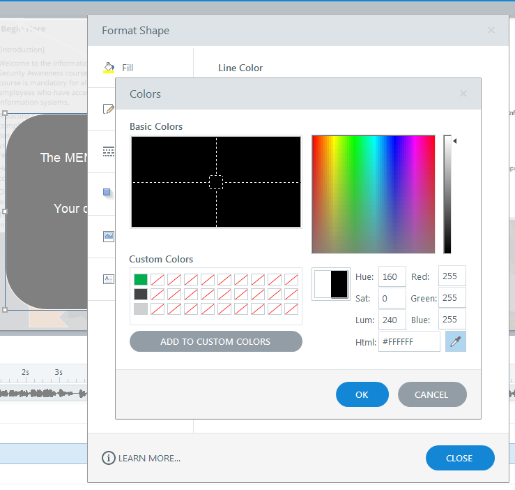 Trying to pick a shape's border color to match other on-screen elements. The eyedropper only works in the dialog box. Once outside, the chosen color is black no matter what the eyedropper is over.