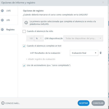 I'm going crazy. There are many settings and options. What´s the combination that gives me the report I need? Is it a Scorm2004 issue? (That´s the standard my client wants). Thanks