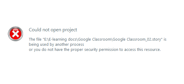 4) Double-click the file to open it in Storyline.Hope that helps, and if you're still running into that error, be sure you're working locally to reduce the risk of it popping up and connect with our support engineers, as they can dig into your setup to help troubleshoot.