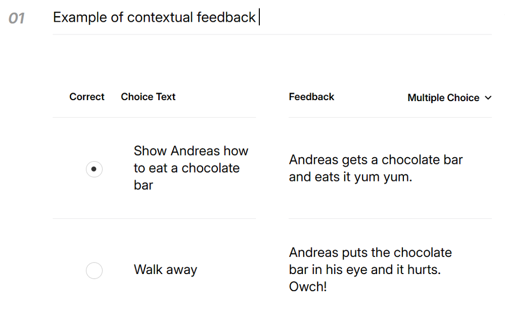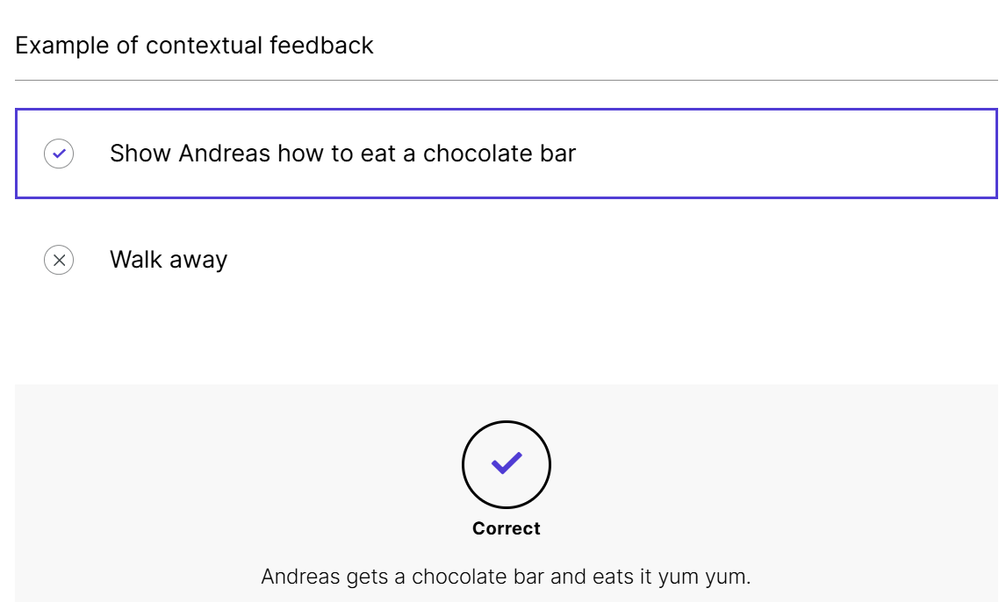 I’ve attached two images as examples. I used the Feedback by Choice option, which is great because it allows custom feedback based on the learner’s decision. Is this functionality something Articulate is planning to add? It would be a big upgrade.