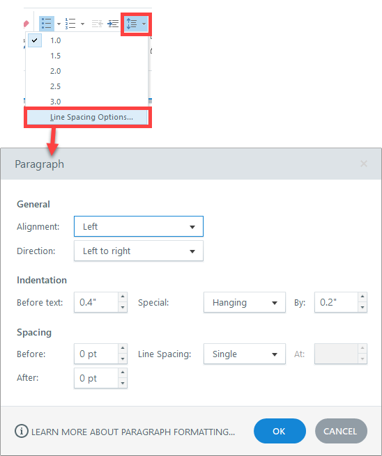 • The Paragraph window lets you adjust the indentation and the spacing for bullets.