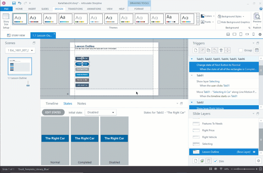 - Add a custom true/false variable (I named it Slide1) to control the Next button when all the tabs have been visited.