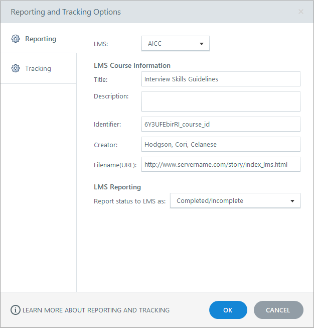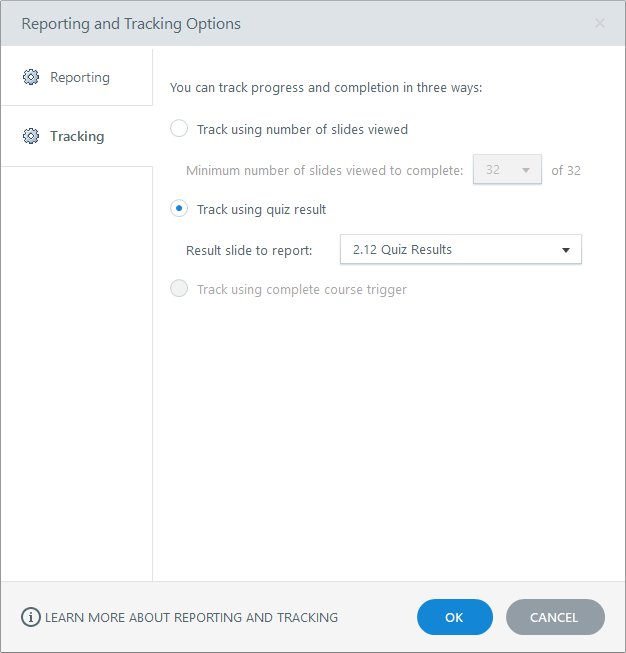 I have built an AICC course in Articulate Storyline 360 with a quiz of 11 questions. The course is set to track completion using the Quiz results slide on Scene 2 Slide 12.