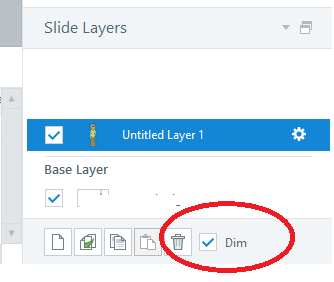 I'm having this same issue. When I deselect dim, the base layer is still dimmed during preview and after I publish it in Review 360. Not quite sure what I'm doing wrong.