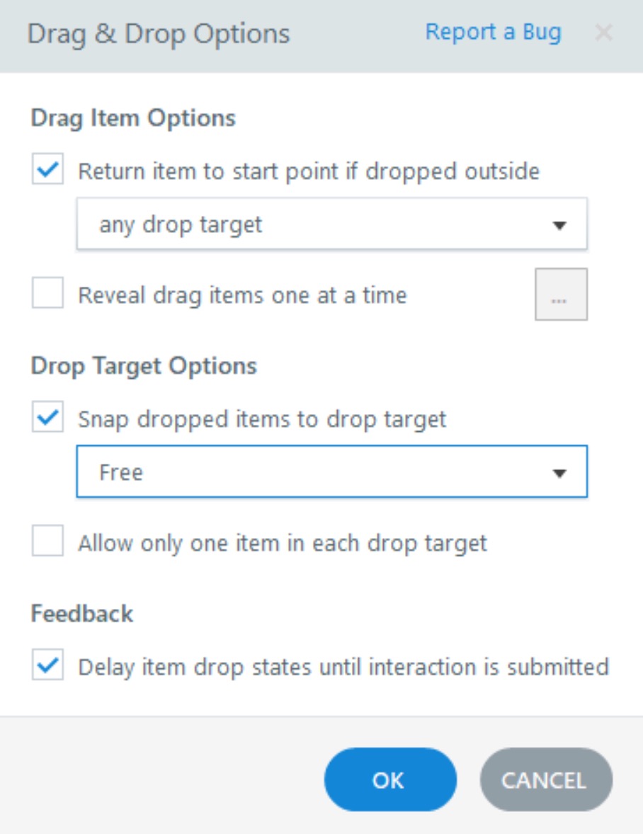 Hello. I am also having a problem with snapping to center when I've done everything I can think of to have it remain where the learner actually drops it (free). I saw a post last week that suggested to right click on object and indicate Free, which oddly was not matching how I'd set it on the ribbon. So the right click solved my problem. On Friday I updated my SL360 and now neither the ribbon or right click are setting as Free, they're going to Center only. Any ETA on when the bug will be fixed?