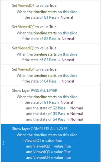 The easiest way to fix your problem might be setting a trigger to show the COMPLETE ALL LAYER when all the post quizzes were done. And add a trigger to the layer to show the PASS ALL LAYER if users pass all the quiz. So if users pass the course, it will trigger the COMPLETE ALL LAYER first and then close the layer immediately while showing the PASS ALL LAYER.- AllieElearningCommunity Member