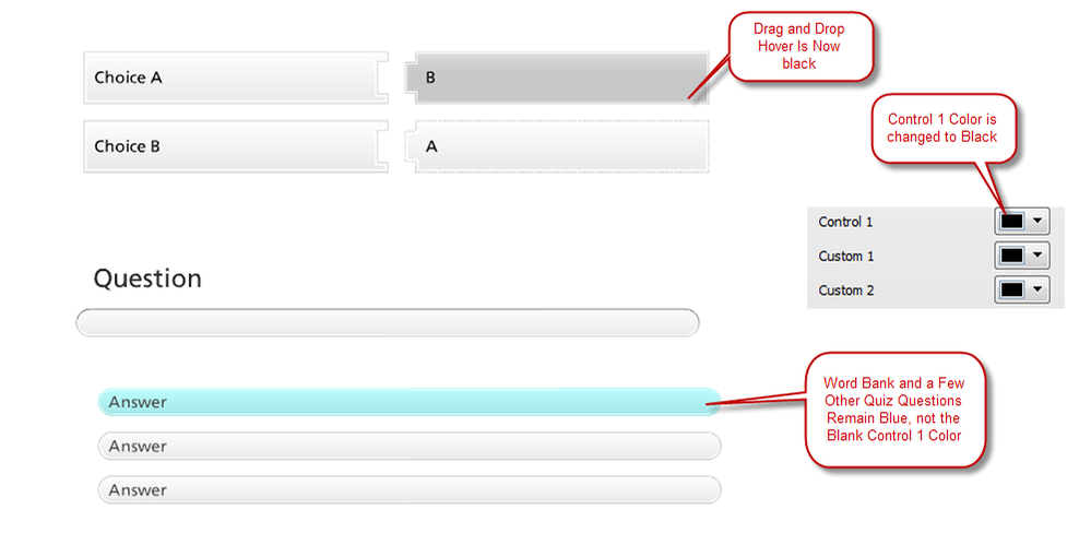 I've been trying to customize the colors for my quiz. I found the this tutorial that explains that when you change the "Control 1" color, it changes the hover colors in the quiz questions. I tried this, and it works for some questions. It seems to work for drag and drop, but for the word bank and a few other, the color remains below, see below. Any ideas, or am I just missing an additional color I am supposed to change? Sorry if this has already been asked, I did a forum search and nothing came up.