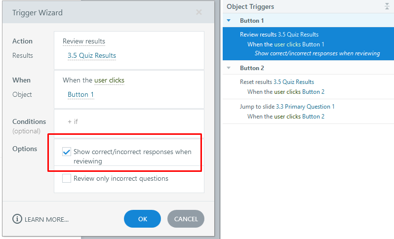 The green arrow is pointing at the custom text I placed on the Review layer that I created. The red arrow is pointing at the list of correct choices that Storyline is randomly placing on its default review layer.