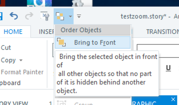 You can cut down on clicks, however. Once you have accessed the Arrange menu on your quick access toolbar, use the keystroke shortcut "r" for "Bring to Front." In the below example, I can make this happen by selecting my object, and typing "Alt+5" and "r".