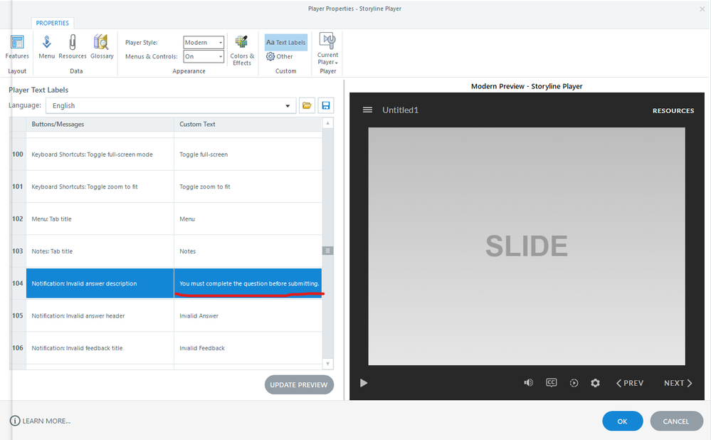 I am creating a quiz in Storyline 360 where when a user clicks on the submit interaction a message box saying 'Invalid Answer _you must complete the question before submitting' is appearing. I want to customize that message but it is not seen the feedback layers panel. Please guide.