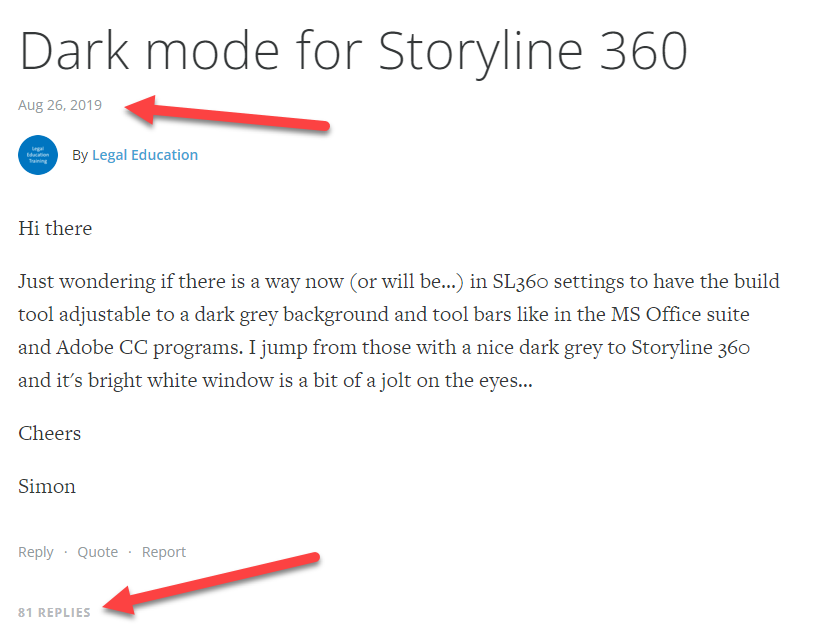 Just wondering if there is a way now (or will be...) in SL360 settings to have the build tool adjustable to a dark grey background and tool bars like in the MS Office suite and Adobe CC programs. I jump from those with a nice dark grey to Storyline 360 and it's bright white window is a bit of a jolt on the eyes...