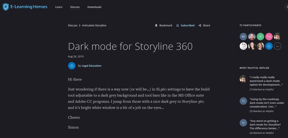 We need a "Dark Mode" for Storyline 360... it's pretty much the industry standard now!
