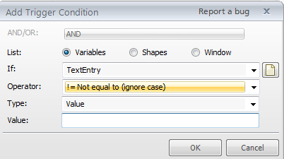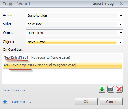 And yes, if you have several text entries on your slide, you'll want to add the conditions for each to the next button trigger. It's always a good idea to name variables so you can keep track of what's going on, as in this example: