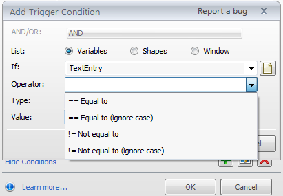 Is there any updated on this? In the "Add Trigger Condition", I'm looking to have my variable "contain" a certain letter. However, the only operator options are: