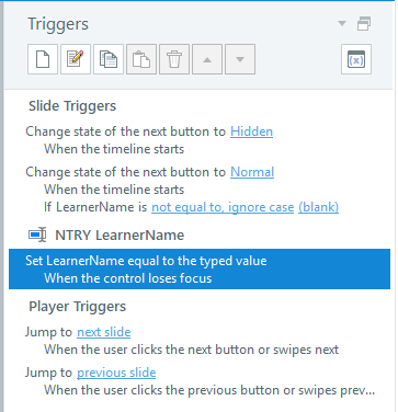 My trigger panel is pictured and I attached my file; when previewing, the Next button doesn't appear when I type my name in the text entry box.
