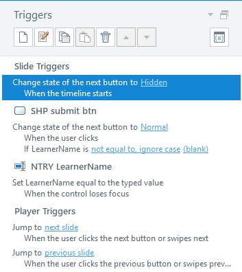 I am trying to create a slide/lesson where the learner will need to enter multiple lines of text on a slide before they can move on. I'm only running into a problem because I can't trigger the data entry to change to a visited or selected state. Since, I cannot change the data entry state I don't know how to make the "next" button appear after the learner has entered in all of the text I would like them to complete.
