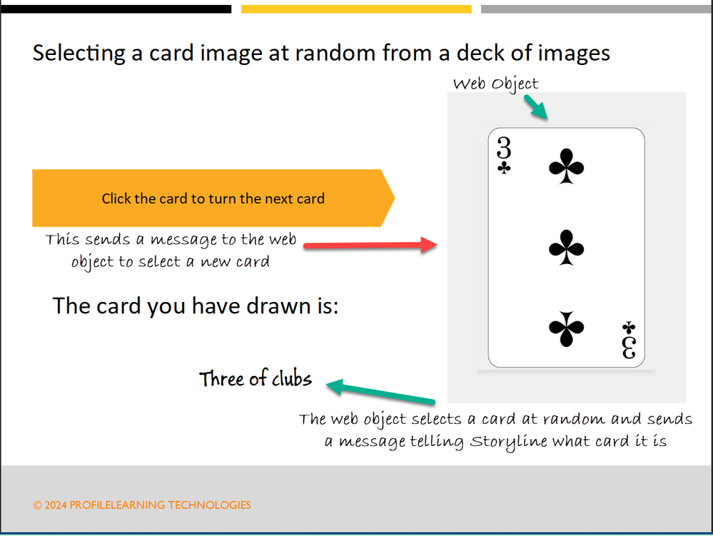 In this demo the card is displayed in an HTML/JavaScript page which is loaded as a web object in Storyline. Clicking a button sends a message to an event handler in the web object that then selects a card at random from a deck of cards it has read in, displays it and then sends a message back to the Storyline via an event handler in Storyline JavaScript code. The JavaScript in Storyline updates a variable (the card description) and you can use a trigger that will be activated if the value of that variable changes setting up a two-way dialogue between Storyline and the Web Object, which (I think) was your question....