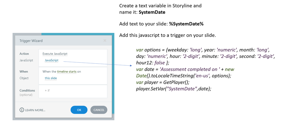 I am looking to add a date stamp that appears on the results slide, so that if asked for a screenshot, we can see what date the learner sat the assessment. I would like it in the following format: