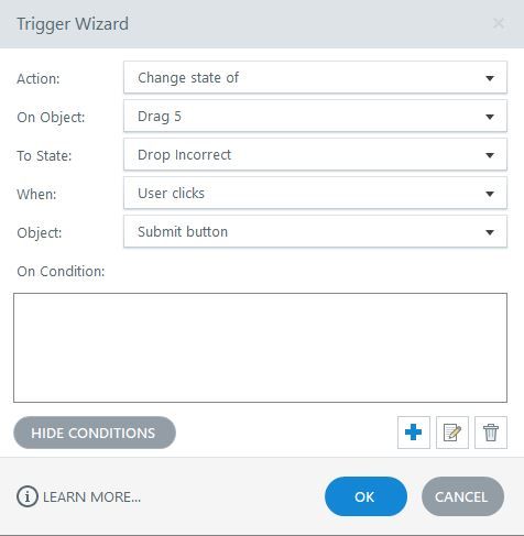 I'm struggling to work out how to do this. Below seems the right way to me, but I need the "Condition" below to be (in my words, not Storyline's) "if drag 5 has been dropped incorrectly". How might I do that? Thank you.
