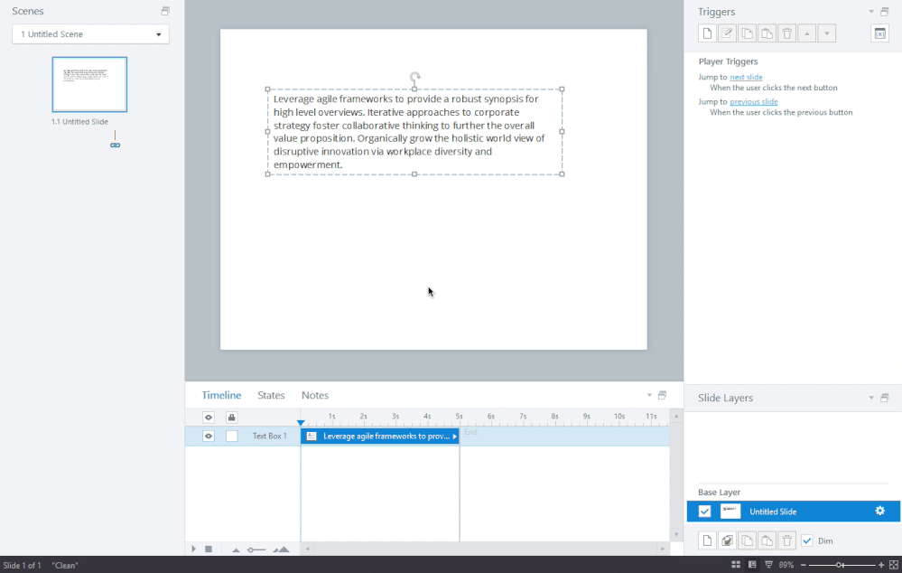 When clicking and dragging to select text, Storyline automatically selects entire words if more than one word is included in the selection. Programs such as Microsoft Word allow this to be turned off.