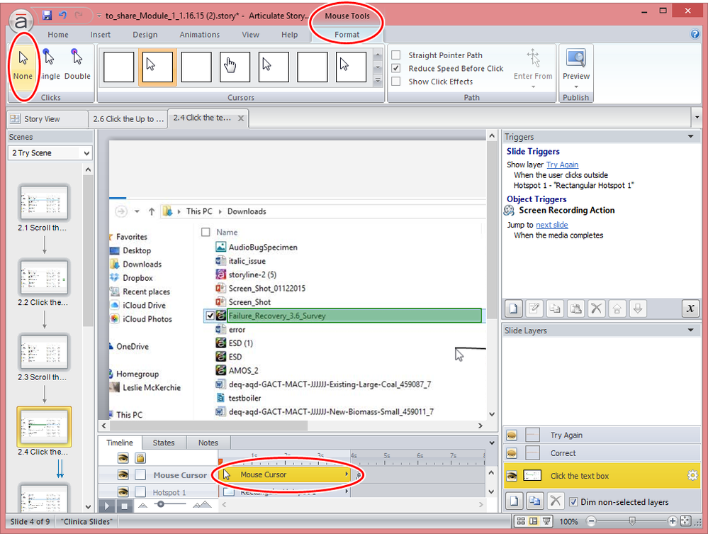 If I insert a screen recording as a Step-by-Step Try Mode, then I do not get a mouse cursor and if I insert it as a Step-by-Step with view mode, then I do get the mouse cursor that I can edit as long as there is editable action.