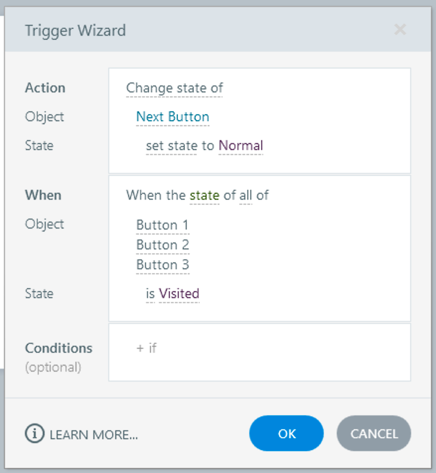 And from here, you can add conditions to add more logic to the slide. Try adding three buttons to your slide and then copying the trigger above, you should see the 'all of' condition shown above. You can find more helpful articles on how to use Storyline 360 here: