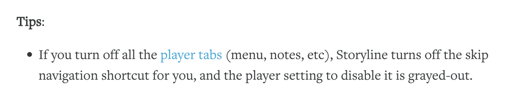Ok, so, I can recreate the problem when I remove everything from the player tabs. I guess this makes sense. No need to skip navigation if there aren't any tabs? But the feature that I want is for the screen reader to get to a "back to top" button once the user arrows down to the bottom of a slide. And that isn't an option when the Disable Skip Navigation is checked. Ideas?