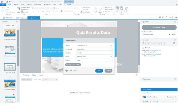 I did try to duplicate this trigger on Success/Failure layers (even though that was not the screenshot I attached). I was so zoned-in on finding the slide layer in the trigger's "Objects" section, I did not see that just above it, I could select the slide layer under "This Slide". Tunnel vision!