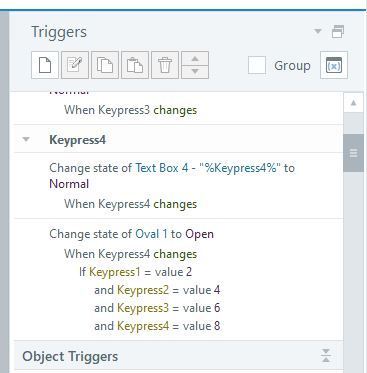 I have also set up the Keypress 1-4 variables to be displayed above the keys on the keypad when their value changes, so that the user can see the code they have entered.