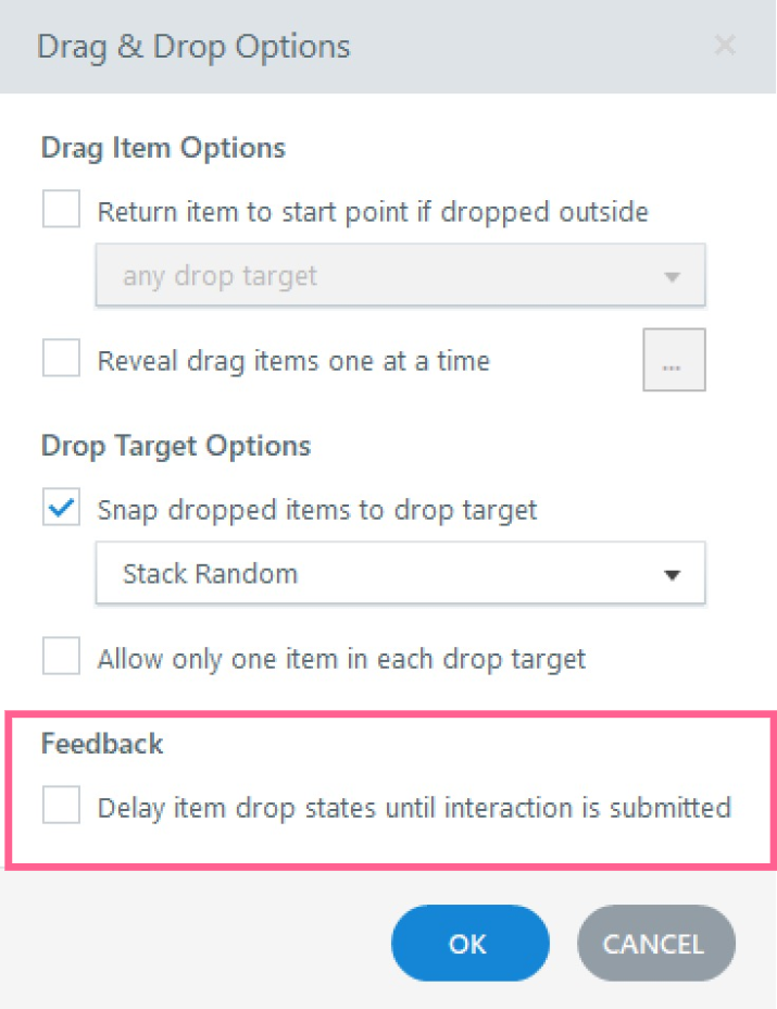 - In the Drag and Drop Options, uncheck the delayed feedback checkbox: