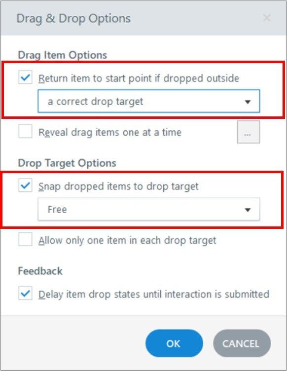 Yes, you can have only correct options dropped on the correct target. As below image, when you choose "a correct drop target", the object will only be dropped on the correct target and will return to where it was if drops on a wrong target.