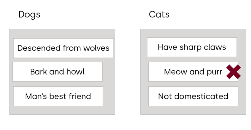For example, looking at the image below, let's say the learner answered "meow and purr" incorrectly, placing it under dogs. Yet, if I show the correct answers on the review slide, and put an "x" next to the one they missed, now it looks like "meow and purr" is in the wrong category.