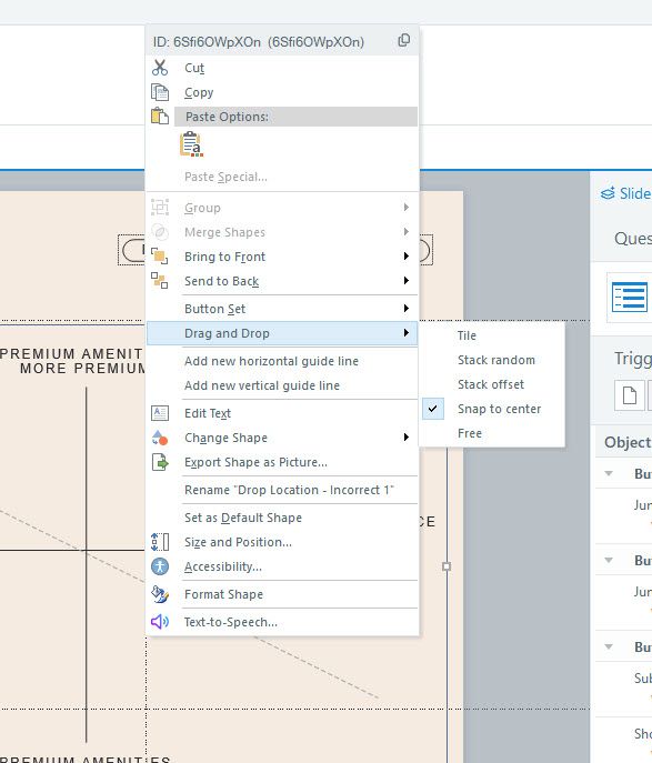 I also created two other transparent rectangles (called 'Drop Location - Incorrect 1' and 'Drop Location - Incorrect 2' - one small and one large, which take up the remainder of the matrix area). I set these up so I could set a trigger to change the state of the Submit button to Normal when the user has dropped the logo.