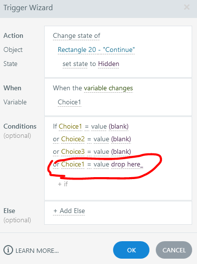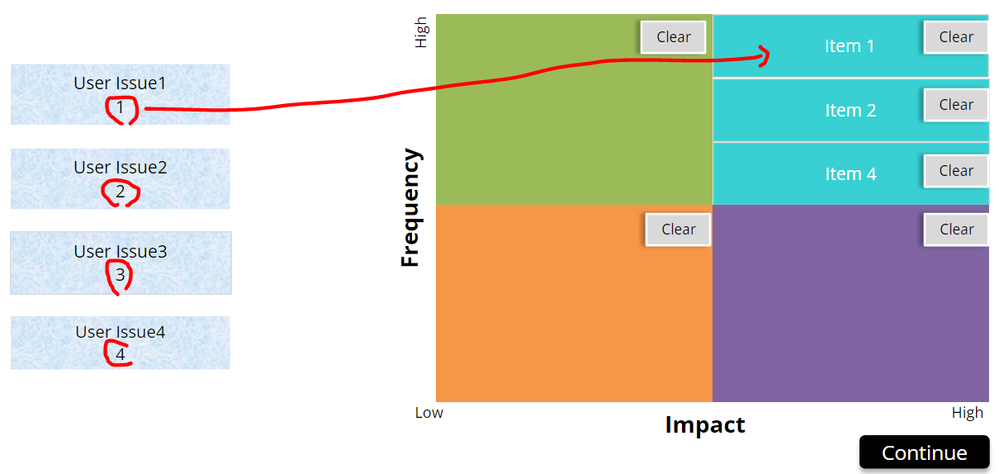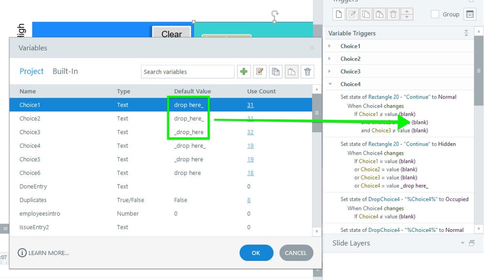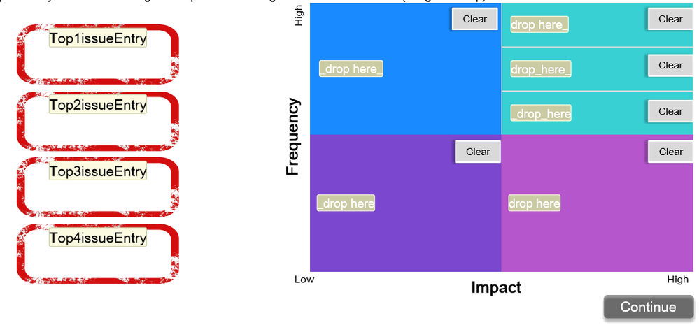 Thanks to jump in~ Kindly refer to the attachment. User's inputs from Slide1 will be populated in the 2nd slide. Then, users need to drag and drop each box in the matrix And 3 of 4 boxes have to be added in the green zone. The other one can be any of the rest of the martix. I gave the unique value to Choice. So, I was thinking to add a condition to Hidden would be enough but not work ^^ll