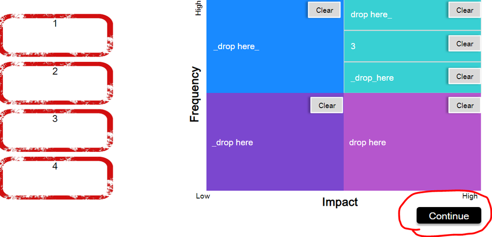 However, as long as I drag a box to any place in the matrix, "Continue" button will be active and users can click to go to the next slide. We would like the "Continue" button to be active when 3 green boxes are not blank.