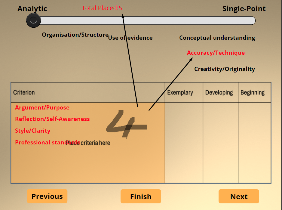 Thank you very much for continuing to update your work JoanneChen (unfortunately, I feel like I'm the only one who noticed...). I checked your demo and, not quite, there's still a small problem 🙂. If I move a proposition (for example, number 2 in the screenshot) and then move it back to the starting area because I changed my mind (which is more “normal” behavior than what I did in my previous response), the “Total Placed” counter remains at 1 even though the drop zone is empty. I can do this four times in a row with four different proposals and set the “Total Placed” to 4 and get the Next button...