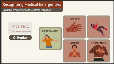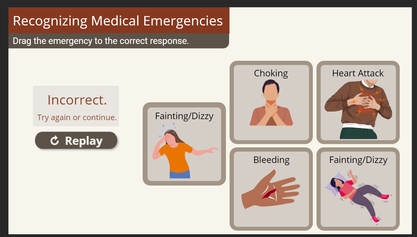 I created a fairly simple drag and drop question for learners. The SME requested no actual quizzing for users, just simple knowledge checks. I created imagery squares, and then added a text box on top of the images to describe what the image represents for each of these medical emergencies.