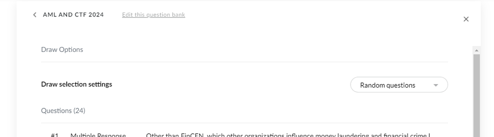 Hi there, Charlie! Are you doing a total of 10 draws or 50 draws? You'll want to go with 10 draws. You can choose to select 5 random questions for each draw from the respective bank. That way, Rise won't present the same question from a question bank.