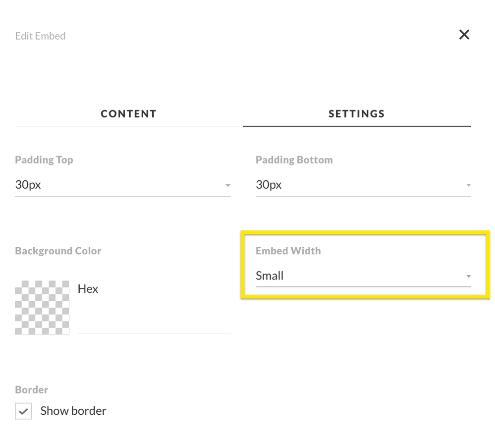 Hi Alyssa, i got a similar situation here. Is there a way to make the embed width smaller than the highlighted "Small" option? Or maybe fit to the code?