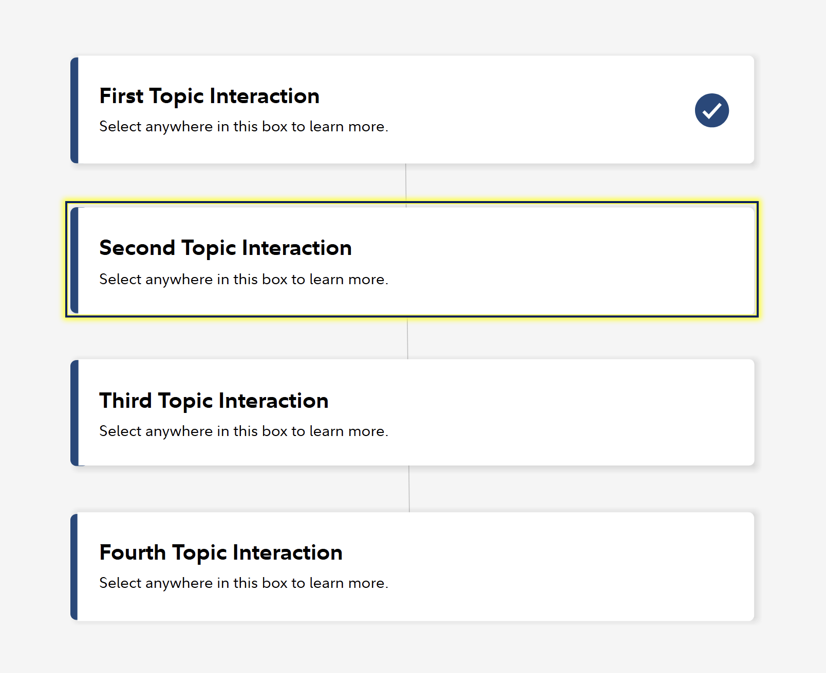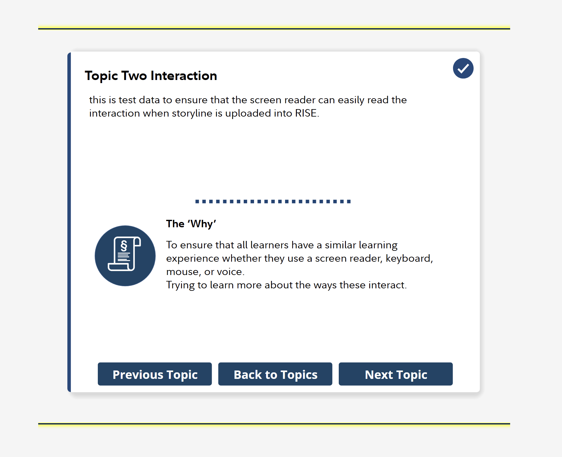 - NVDA was able to read the text inside the interaction boxes. In the highlighted example, NVDA read the text in one go, reading "Second Topic Interaction" first, followed by a brief pause, then "Select anywhere in this box to learn more <dot> button". Are you hearing something else when using NVDA and the tab key to navigate to these interactive blocks in the embedded Storyline 360 course?