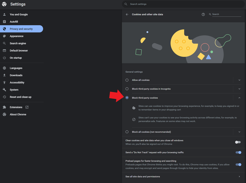 However, for our needs this was too cumbersome and so we tried to find another solution. We discovered another workaround that might work for some of you. We were playing around with the cookie settings in Chrome and it turns out that when we enabled the setting "Block third-party cookies", the full screen button worked perfectly! For those unfamiliar with how to find the setting, I took a screenshot. To navigate to the setting: