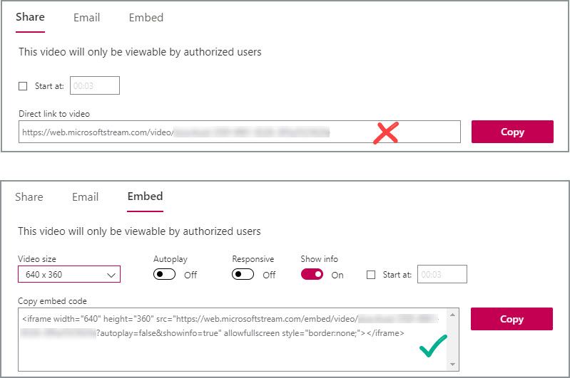 When try to embed a Micosoft Stream video using the Share link (a basic URL), Rise won't embed the video. It often displays a "login" message and if you click on it , it takes you to Stream in a separate window - Not an idea user experience.