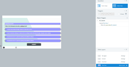 Hello, I have a knowledge check scenario with 3 attempts, 4 answer options, and a custom submit button. Here's what I need: When the learner selects the correct answer, the "Next" button should ap...