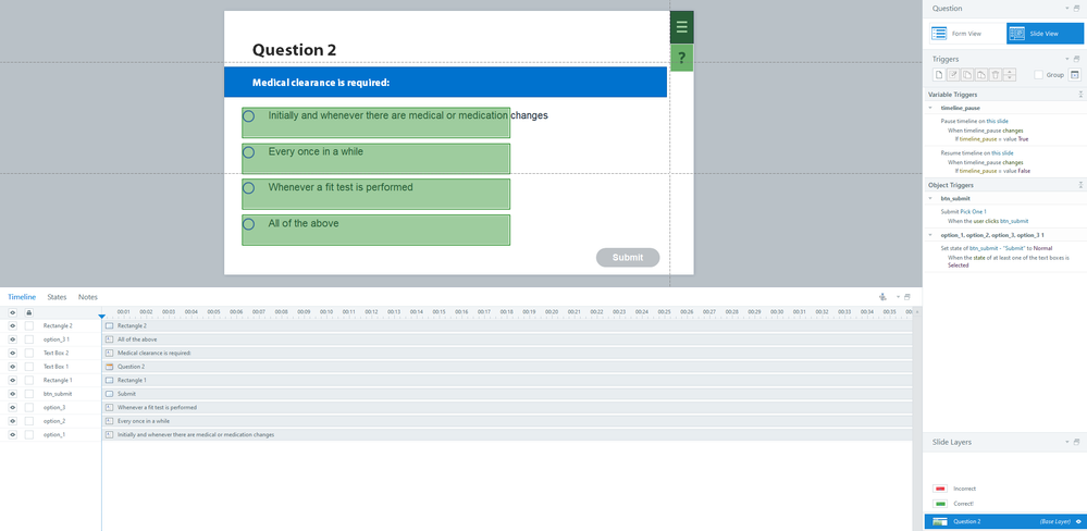 I need some help troubleshooting this file. It displays Question 1 fine, and it displays the "correct" and "incorrect" layers as it should. But when I choose "Continue", it jumps to the results instead of to Question 2 as indicated by the triggers. When I watch closely, I can see that it actually DOES bring up Question 2, but then jumps to the results.
