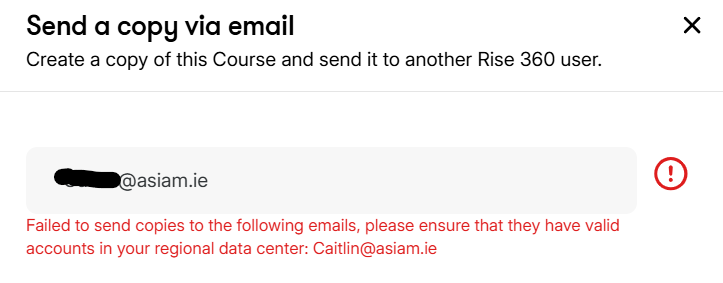 Failed to send copies to the following emails, please ensure that they have valid accounts in your regional data center: (name@domain.ie)