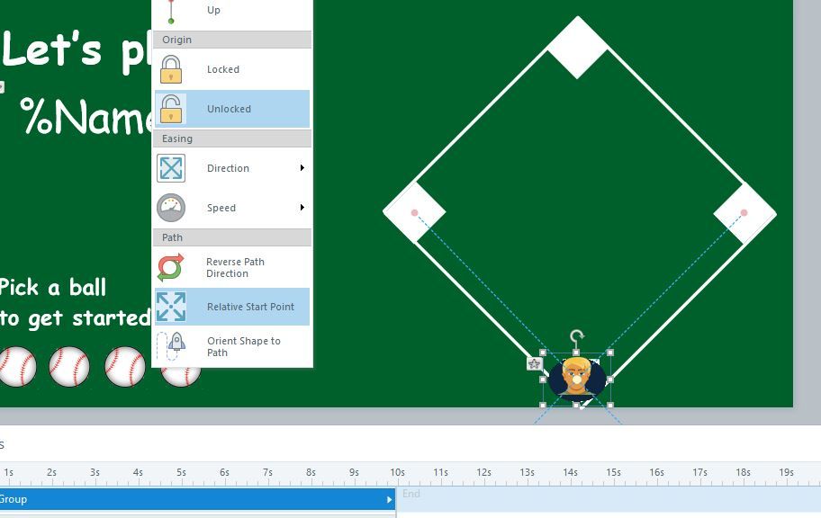 I have am creating knowledge check questions and depending upon the answers provided, the learner will move to a different base on the baseball diamond. Learners select one of four baseballs to reveal a question. Since they can select any of the four baseballs, I want Storyline to evaluate which base they are on when they click to reveal a question and if they select the correct option SL will evaluate the points total to determine if the player should move to first base, second base, third base or back to home. The problem I am having is that I am not sure what is needed so that SL can evaluate the points total to know that a value of 1 is first base, value of 2 is second base etc. Hoping you can help me. Thanks.
