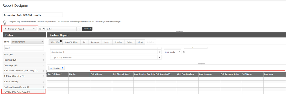 CSOD just came out with new custom report fields at the end of last year under Transcript Reports. They are under the section titled "Scorm 2004 Quiz Data." I've attached a screenshot of how I set up a report using them that works well for me.