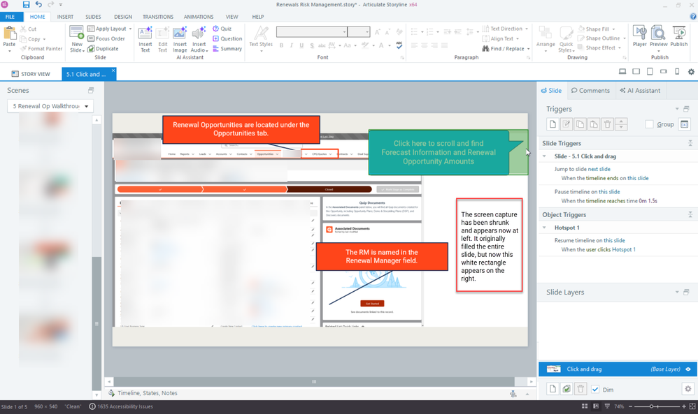 I'm updating a scene I created a few months ago. It contains a short screen recording spread out over 5 slides. I updated Storyline yesterday. When I went to make my updates to the scene in question, I realized that the screen recording had been bizarrely resized, and by no clear action of my own. It was somehow shrunk and it no longer fills the slide as it originally did (see screenshot below). I cannot adjust the screen recording size because, apparently, we have been waiting for that functionality from Articulate for about four years. Any input would be appreciated. Re-creating the screen recording from scratch is not going to be easy in this case.