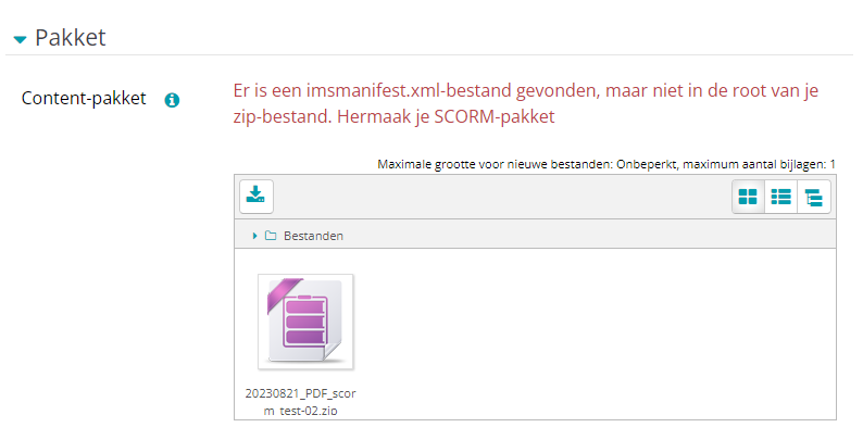 - When I want to upload the SCORM to our LMS, I get this error in red in dutch (see 1st attachment 'screenshot_error'), which means so much as: “An imsmanifest.xml file was found, but not in the root of your zip file. Recreate your SCORM package.”. I retried several times by republishing in SCORM and adding the codelines and png-file again, but the error on the LMS remains. How do I solve this issue first, so that I am able to finally test if the scorm-file is actually generating the PDF?