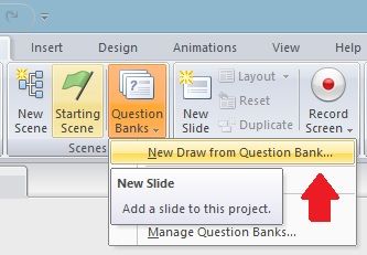 If neither of these methods works for you, you should be able to insert questions in the question bank into a scene by using the "Question Banks" menu in the "Scenes" section while in Story view. Select "New Draw from Question Bank...". After doing so, you'll be able to select the questions you'd like to insert into a scene.
